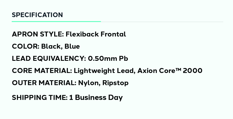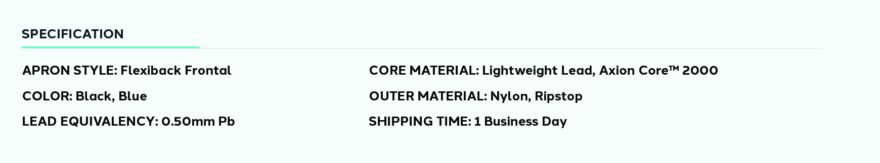 The Flexiback Frontal Lead Apron is suitable for both men and women and is available in three core materials: Lightweight Lead, Axion Core™ 1000, and Axion Core™ 2000, each providing a 0.50mm Pb lead equivalency. You can choose between two outer materials, Nylon and Ripstop, with color options of blue or black featuring black binding. This apron is offered in five sizes, ranging from small to extra extra large, and complies with the ASTM F3094-14 testing standard.