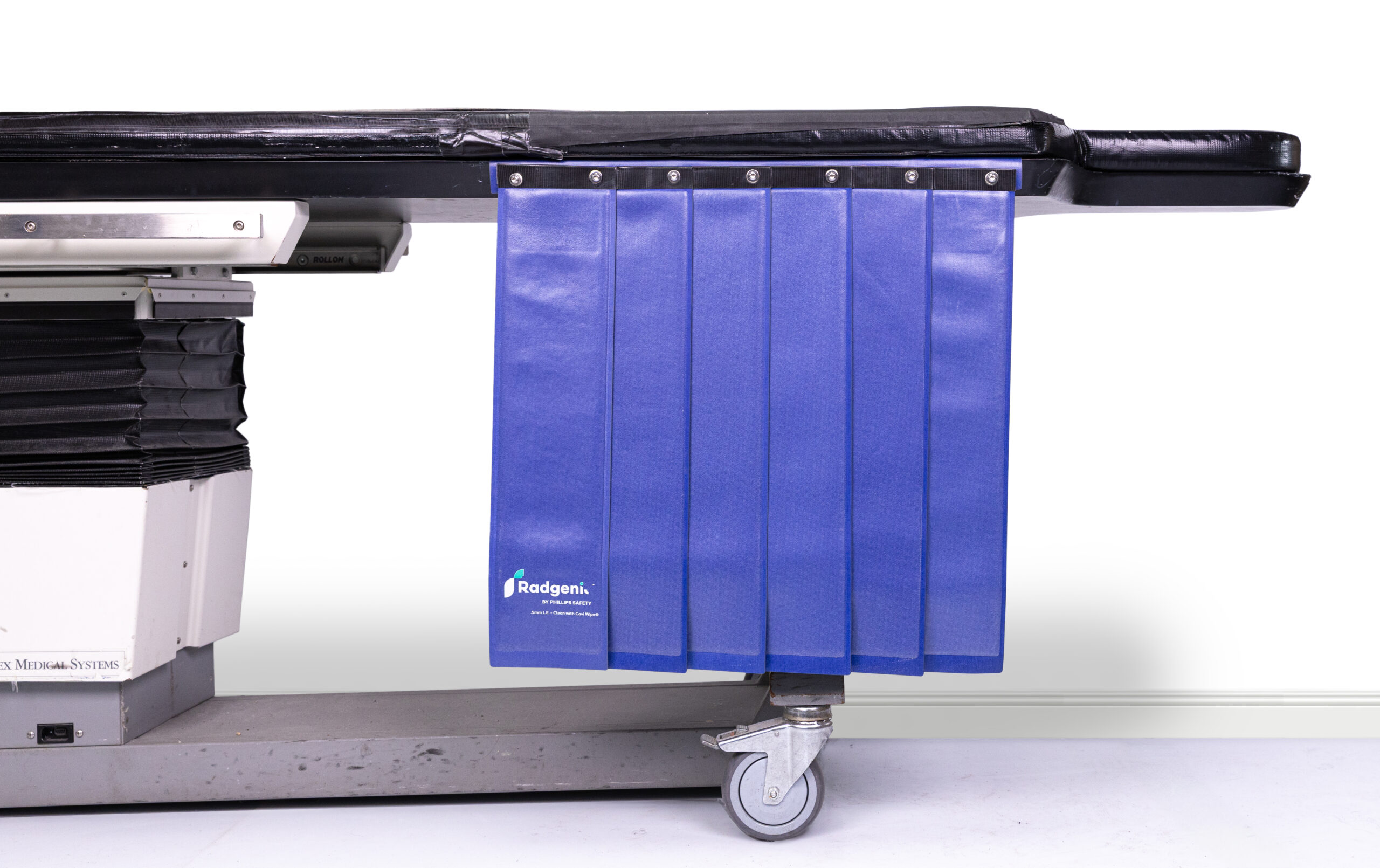 Unlike other shields, this Radgenic®️ model uses Dual-Lock cleanable plastic-style Velcro for a secure fit. This fastening system is designed for durability and can withstand repeated cleaning and disinfection cycles without degrading. The Table Shield comes with a separate corresponding Strip of Dual-Lok to be placed by the end user on the Imaging Table surface.