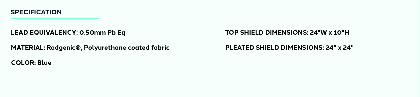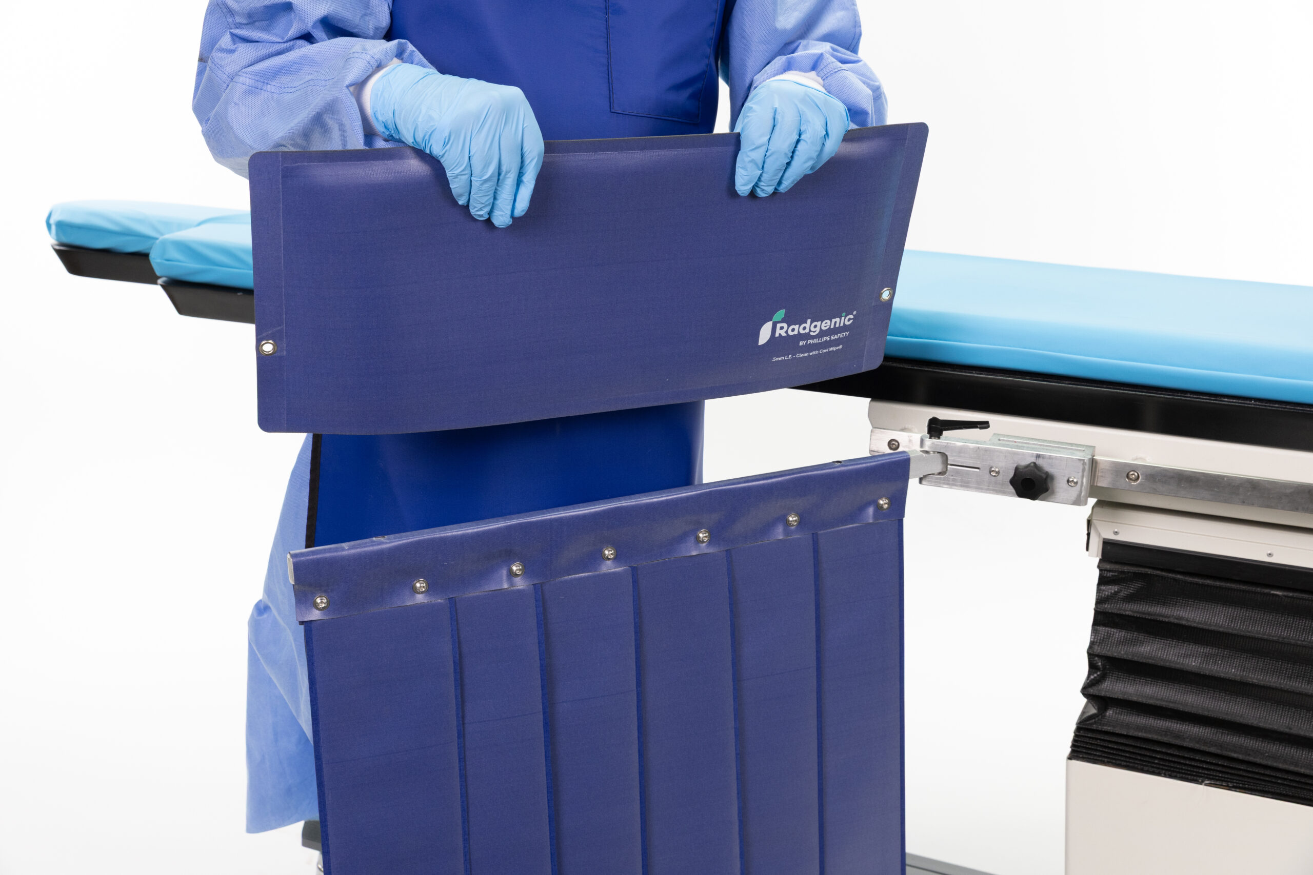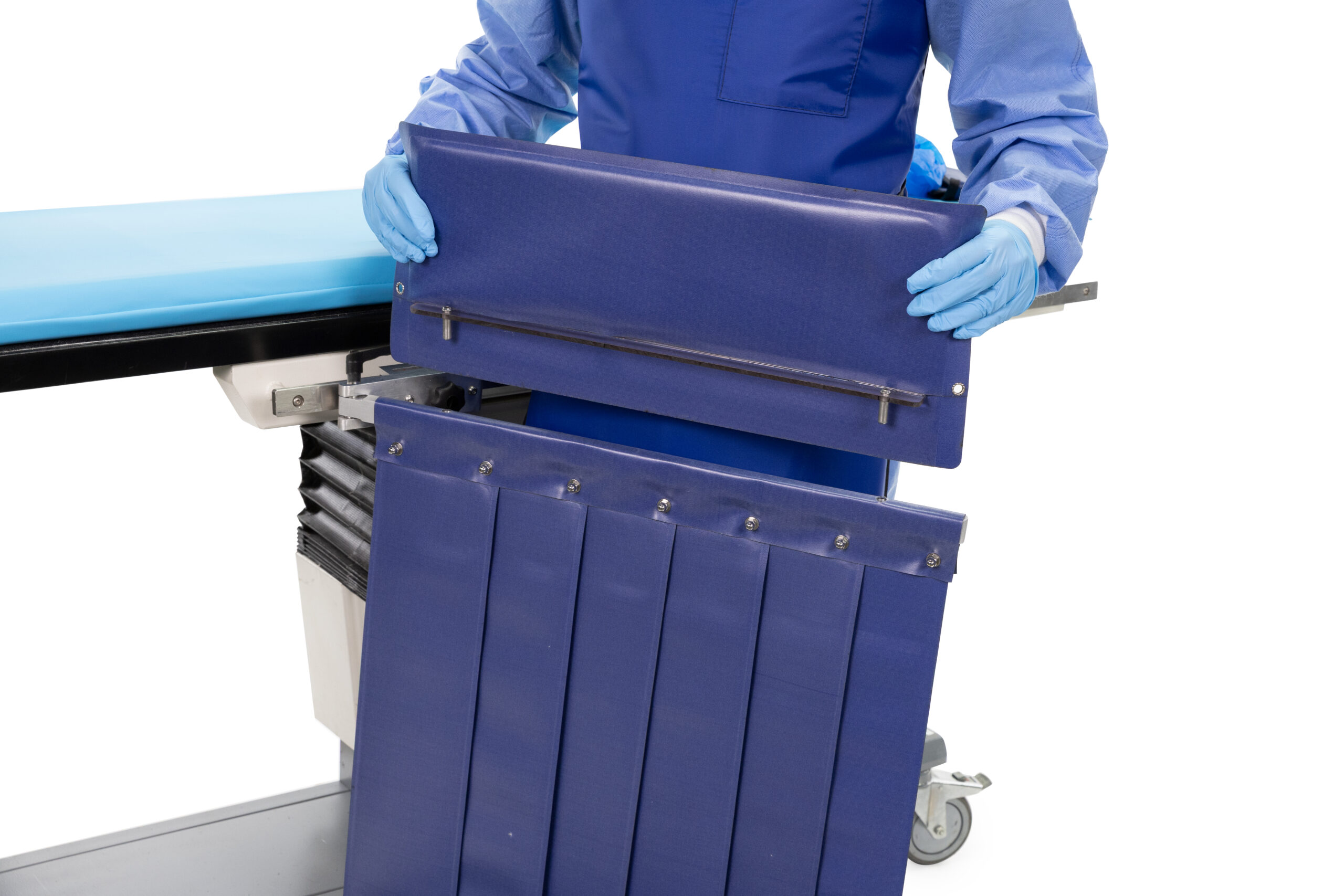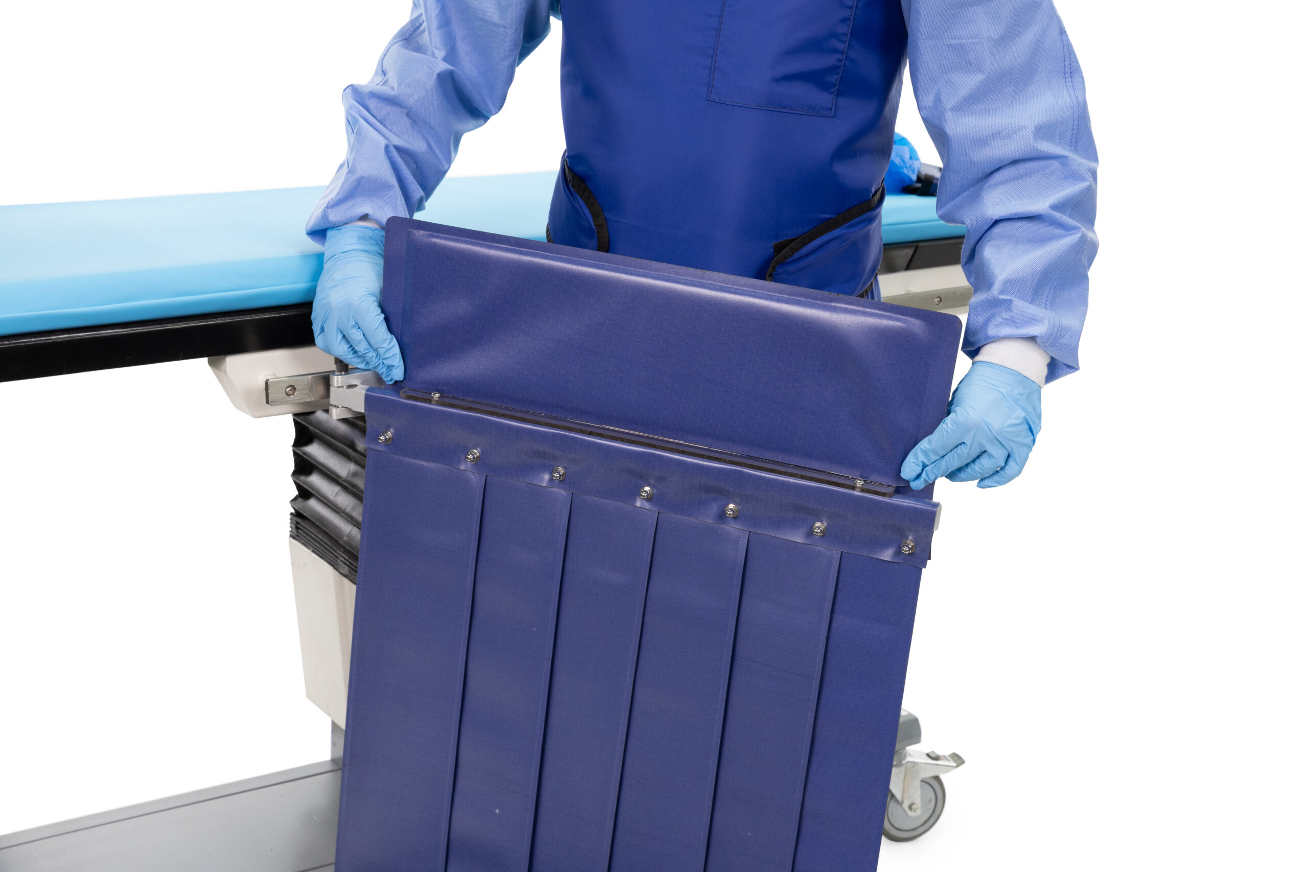 - Pleated Shield (24″ W × 24″ H) – The pleated section follows the C-arm under-table arc to stop stray radiation at its source.
