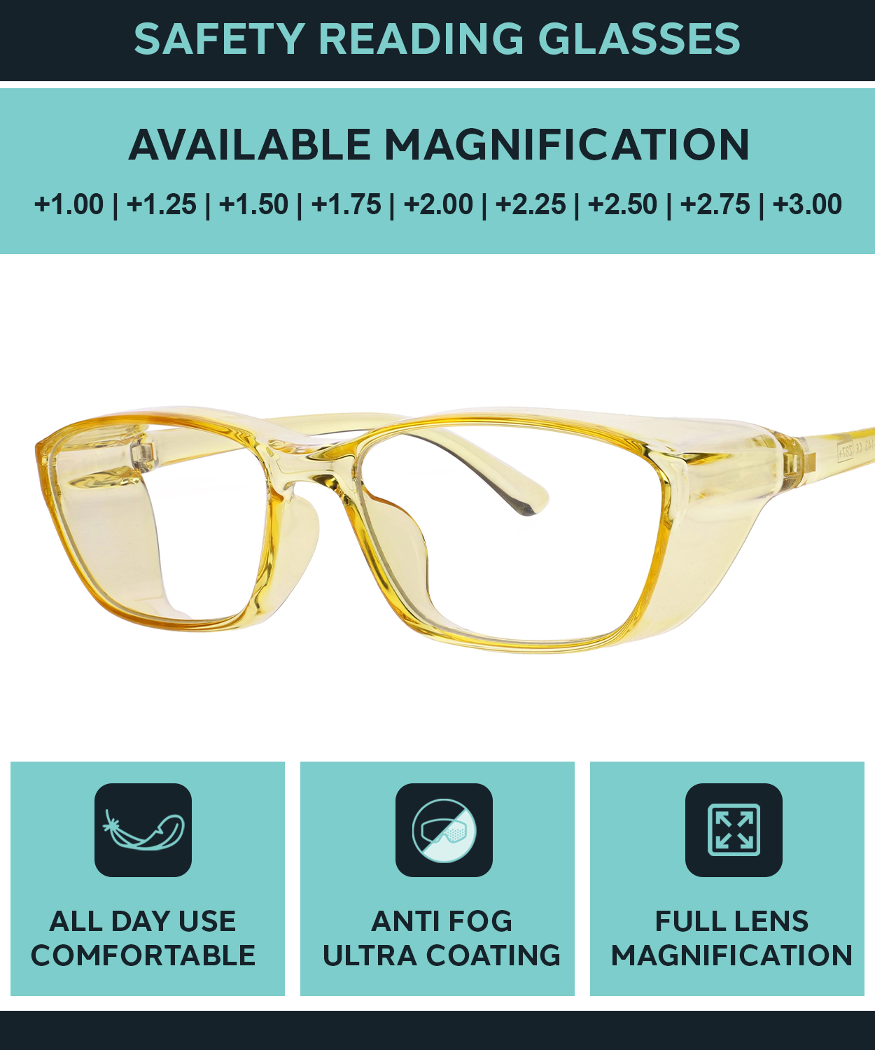The Safety Reading Glasses TR512 have a rectangular frame with anti-fog lenses. These safety glasses feature magnifying lenses which reduce fatigue and eye strain. The TR512 safety reading glasses are lightweight and made of high-quality plastic construction. Plus, these safety reading glasses feature integrated side shields for additional lateral protection. They are available with magnification from +1.00 to +3.00.